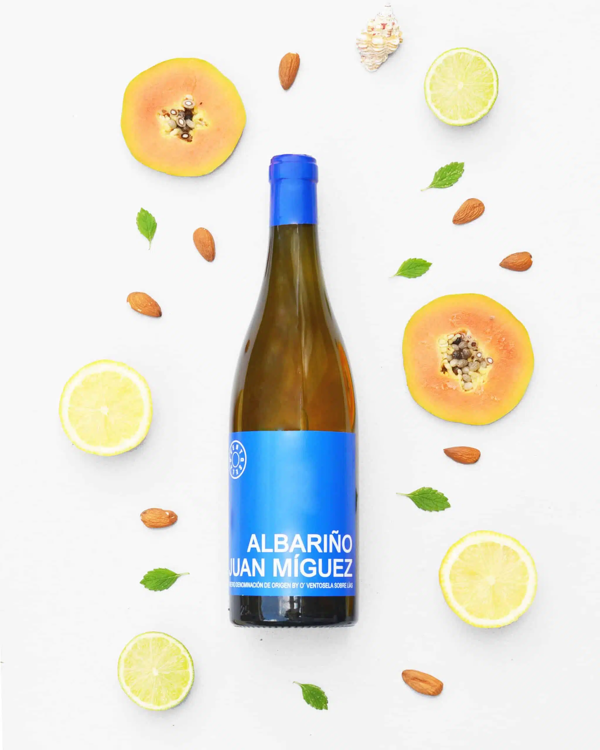 SMAAKPROFIEL – In z’n nakie is Albariño een heerlijke, droge witte wijn met volop aroma’s van citrus, witte perziken en limoenbloesem. De beste wijngaarden voor Albariño zijn gelegen aan de noordwestkust van Galicië in Spanje, waardoor je er vanwege de Atlantische invloeden vaak ook nog een subtiele ziltige smaak bij krijgt. De nieuwste trend in Spanje is echter experimenteren met sobre lías: rijping op de gisten. Het is langs de Atlantische kust overgewaaid vanuit Muscadet, waar sur-lie rijping al eeuwigheid een begrip is. De Albariño van Juan Miguez lag 6 maanden te rijpen en ze worden nog rijk van dat niets doen ook. Dag in dag uit komt er een extra smaaklaag bij, totdat er genoeg smaakverdiepingen bij zijn gekomen om de fles in te gaan. Het maakt van deze Albariño een aromatische, rijpe en vooral romige wijn met aroma’s van limoen, citroen en papaja. Het is Albariño in z’n zondagse pak.