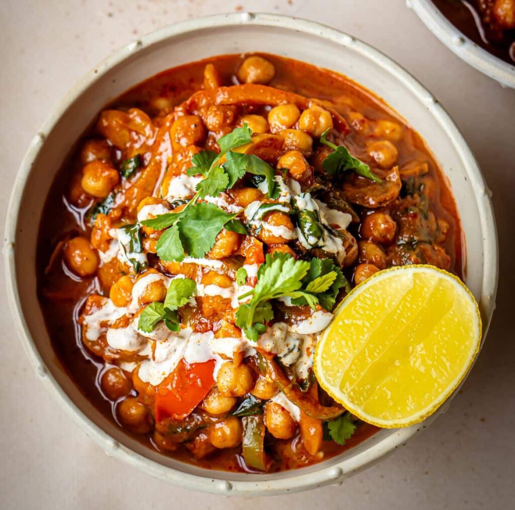 KRUIDIGE KIKKERERWTENSTOOF MET HARISSA, PAPRIKA EN TAHINDRESSING