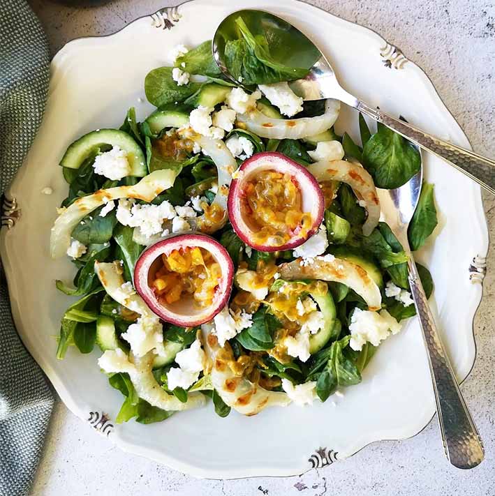 TROPISCHE SALADE MET VENKEL, PASSIEVRUCH EN GEITENKAAS UIT EN DE KEUKEN VAN FOXILICOUS.NL