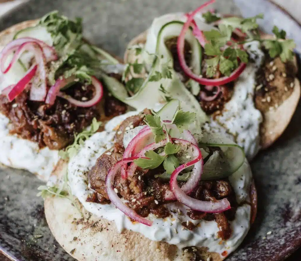FRISSE TOSTADA MET PULLLED AUBERGINE, TZATZIKI EN INGELEGDE RODE UI VAN CIELS TABLE TALES